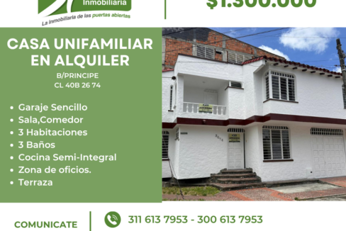 CASA UNIFAMILIAR EN VENTA EN EL BARRIO PRINCIPE EN LA CL 43 24-85