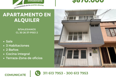 SE ALQUILA APARTAMENTO UBICADO EN EL BARRIO SALESIANOS EN LA Cll 30#26-37-PISO 2