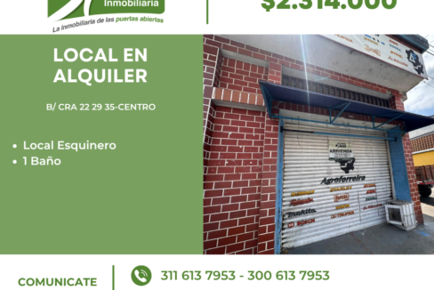 LOCAL EN ALQUILER UBICADO EN EL CENTRO- EN LA CR 22 29-35