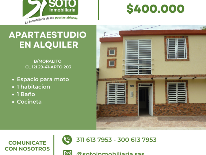 SE ALQUILA PARTAESTUDIO DE UN SOLO AMBIENTE UBICADO , UBICADO EN EL BARRIO MARALITO, CONSTA DE : UNA HABITACION CON CLOSET, UN BAÑO, COCINETA, ESPACIO PARA UNA SOLA MOTO, ZONA DE OFICIOS COMPARTIDA, SERVICIO DE AGUA, ENERGIA, GAS Y TV INCLUIDOS.