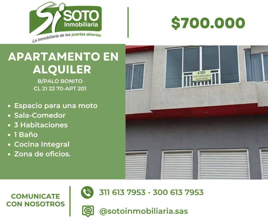 apartamento que consta de: espacio para una moto, sala,comedor, 3 habitaciones, 2 con closet, 1 baño social, 1 baño privado, cocina integral con gas domiciliario, zona de oficios.