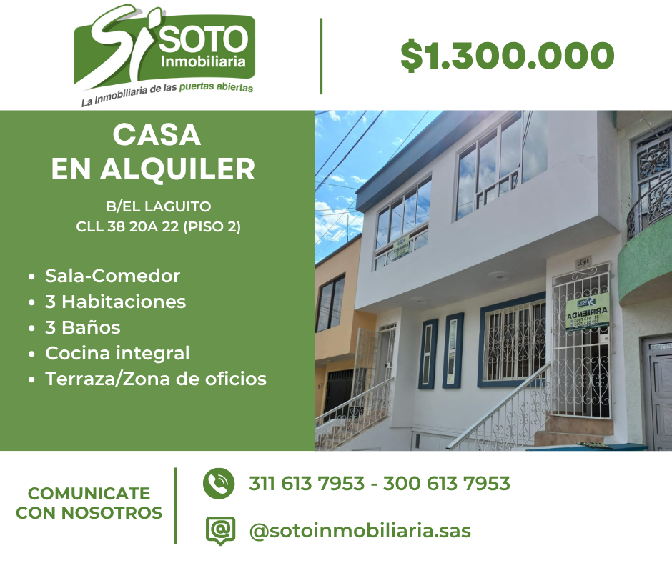 Se alquila Casa en el barrio el laguito con excelente ubicación consta de; Garaje compartido, sala-comedor, cocina integral con gas domiciliario, 2 baño sociales, 1 baño privado, 3 habitaciones con closet, sala de tv, terraza, cocina auxiliar en la terraza y un baño completo en la terraza.